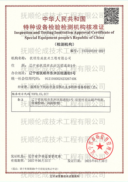 撫順倫成技術(shù)工程有限公司成立于1996年6月20日,是具有獨(dú)立法人資格的檢驗(yàn)檢測(cè)有限責(zé)任公司。公司專業(yè)從事特種設(shè)備壓力容器的檢驗(yàn)檢測(cè)(含理化試驗(yàn))工程。公司具備特種設(shè)備、建設(shè)工程、石油化工等行業(yè)的無損檢驗(yàn)檢測(cè)資格,先后取得遼寧省市場(chǎng)監(jiān)督管理局頒發(fā)的“特種設(shè)備檢驗(yàn)檢測(cè)機(jī)構(gòu)核準(zhǔn)證”;遼寧省市場(chǎng)監(jiān)督管理局頒發(fā)的“檢驗(yàn)檢測(cè)機(jī)構(gòu)資質(zhì)認(rèn)定證書”(CMA);遼寧省生態(tài)環(huán)境廳頒發(fā)的“輻射安全許可證”……